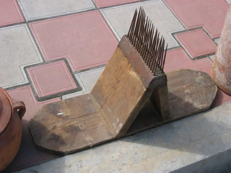 Само по себе валяние шерсти представляет собой особую технику, называемую фелтинг, в которой придумывается и реализуется рисунок на поверхности. В технике фелтинг можно делать мягкие игрушки, картины из шерсти, различные аксессуары и многое другое. Однако наши предки выполняли эту работу для более практичных целей – изготавливали ковры, на которых красовался национальный орнамент. Очень популярны были бурки. Шерсть в основном к работе готовили вручную, а для ускорения этого процесса применялось вот такое приспособление.